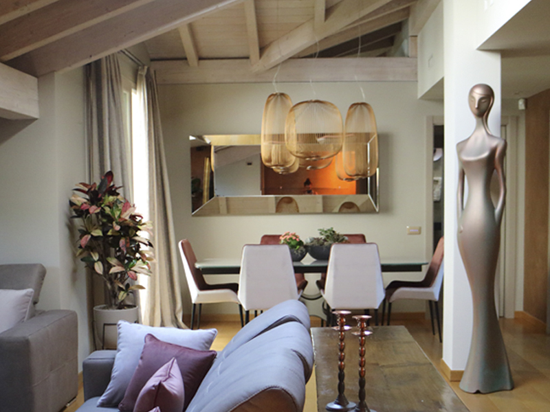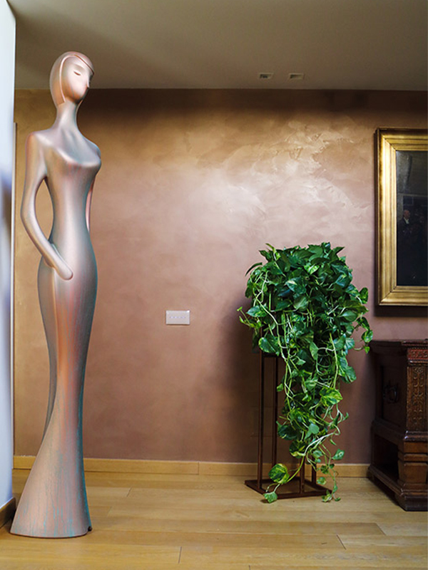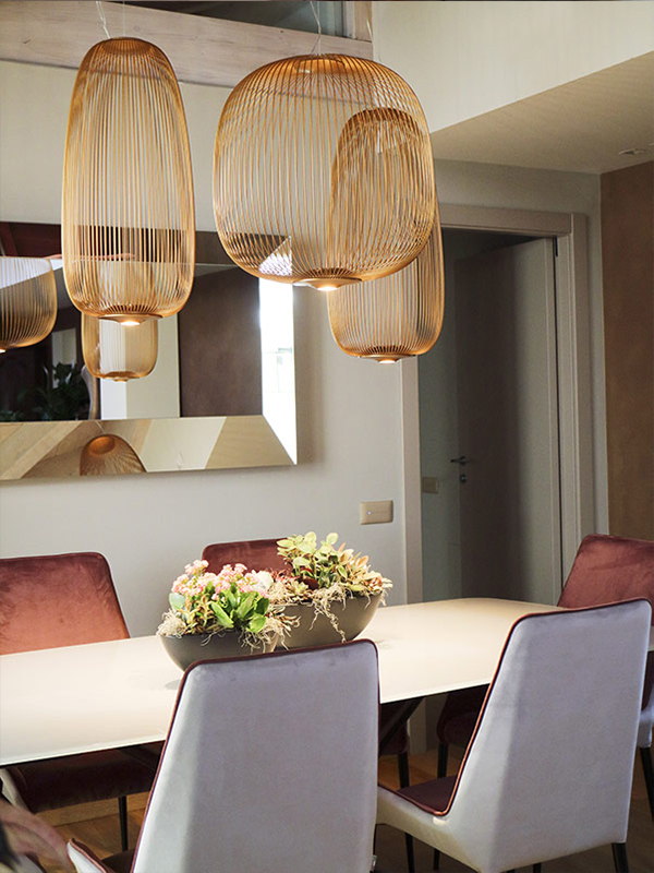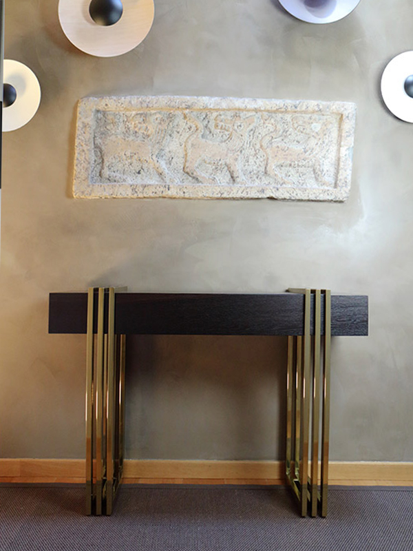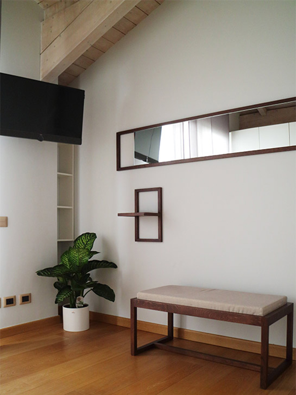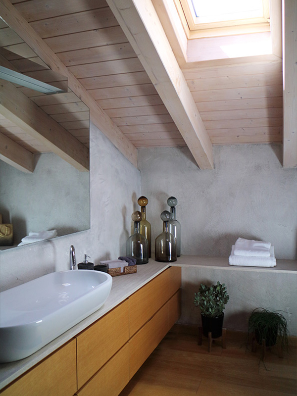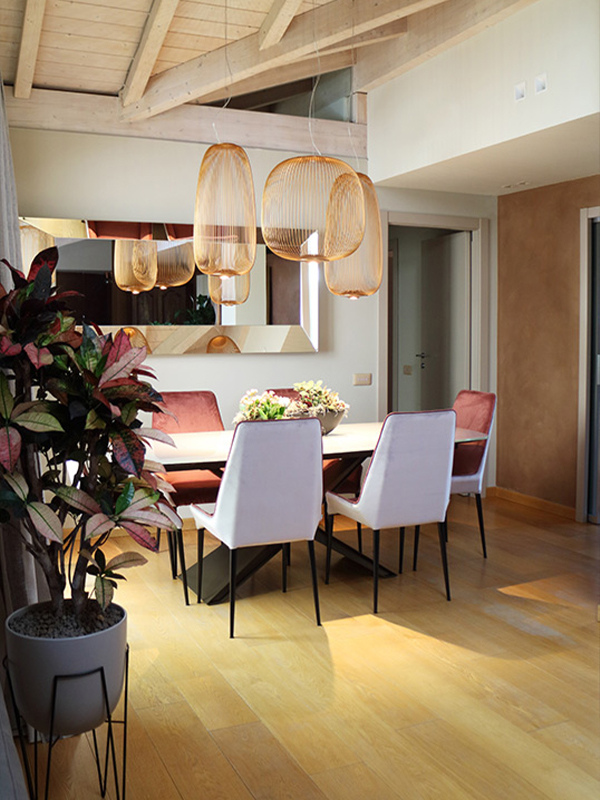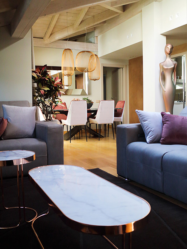 I materiali scelti per questo progetto contribuiscono a definire gli spazi d’uso di questo attico. Toni caldi e freddi sono utilizzati per identificare i vari ambienti. I colori caldi vengono utilizzati per individuare gli ambienti conviviali e padronali tramite l’accostamento di metalli quali rame o ottone, marmi dalle ricche venature dorate, legni, tecniche a parete, rivestimenti e tappezzerie utilizzati nei toni cioccolato e tortora. Le tinte fredde identificano invece gli spazi tecnici o di servizio quali i bagni, la palestra o lo studio, con tecniche a parete effetto cemento, accessori e arredi bianchi o neri e legni appositamente ingrigiti.