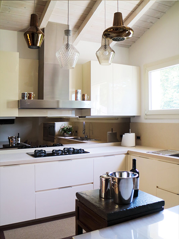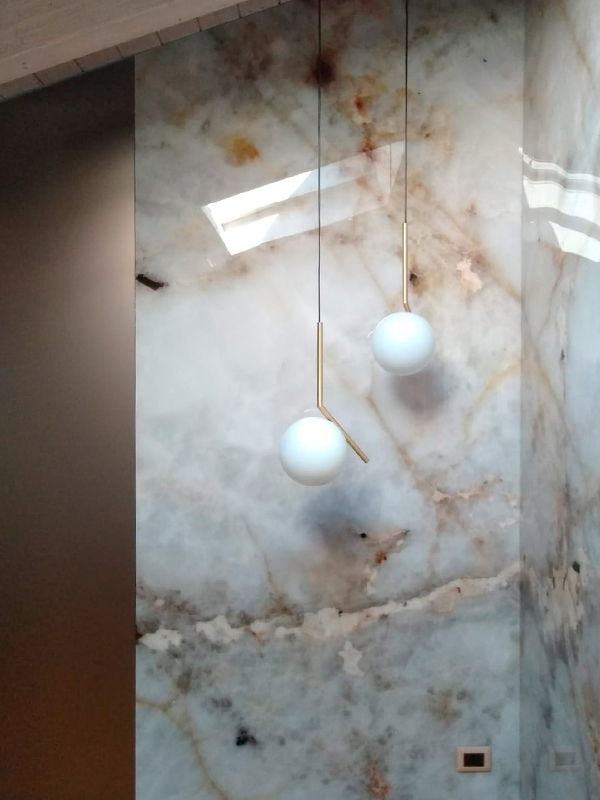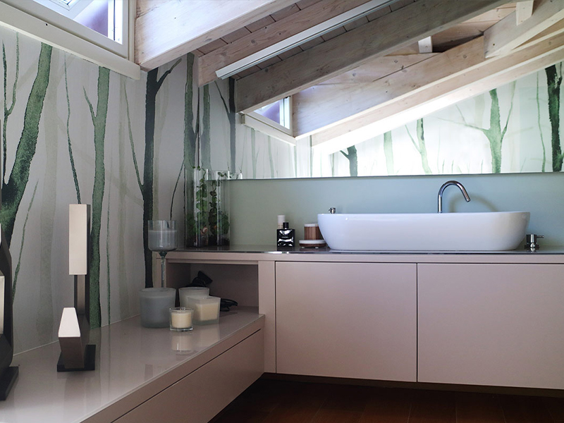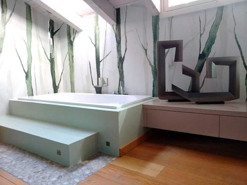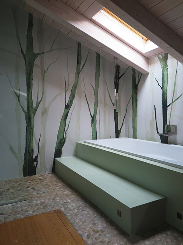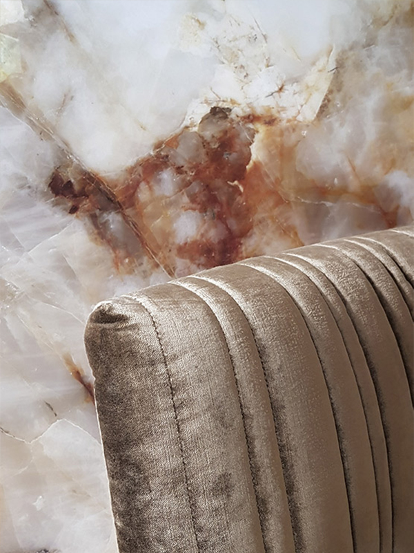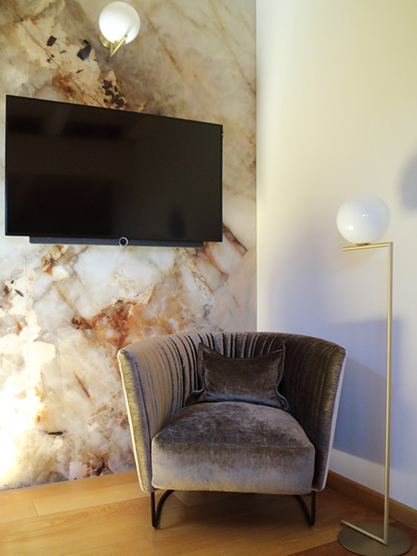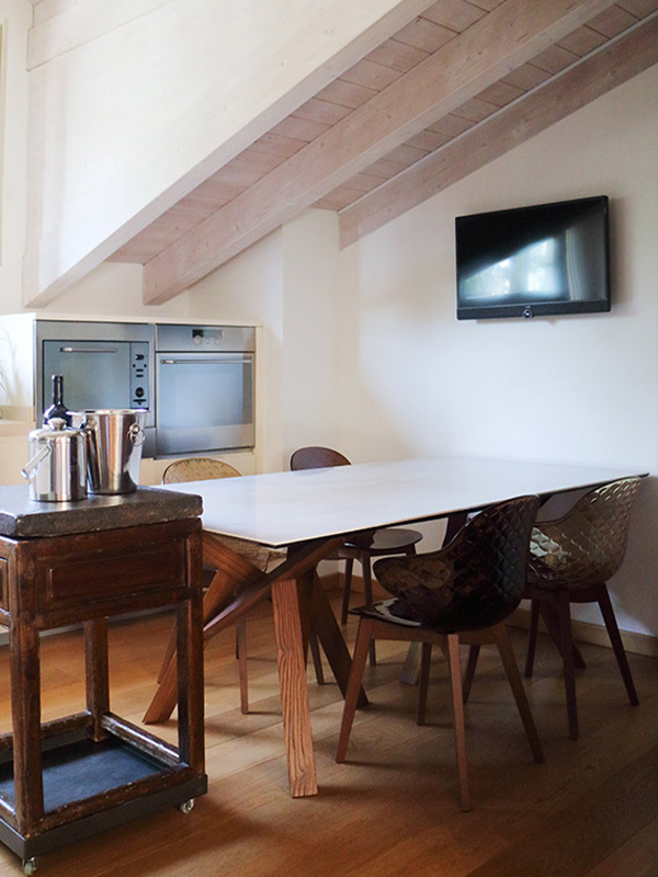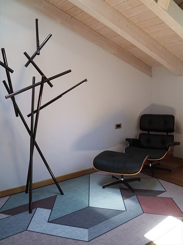 I materiali scelti per questo progetto contribuiscono a definire gli spazi d’uso di questo attico. Toni caldi e freddi sono utilizzati per identificare i vari ambienti. I colori caldi vengono utilizzati per individuare gli ambienti conviviali e padronali tramite l’accostamento di metalli quali rame o ottone, marmi dalle ricche venature dorate, legni, tecniche a parete, rivestimenti e tappezzerie utilizzati nei toni cioccolato e tortora. Le tinte fredde identificano invece gli spazi tecnici o di servizio quali i bagni, la palestra o lo studio, con tecniche a parete effetto cemento, accessori e arredi bianchi o neri e legni appositamente ingrigiti.