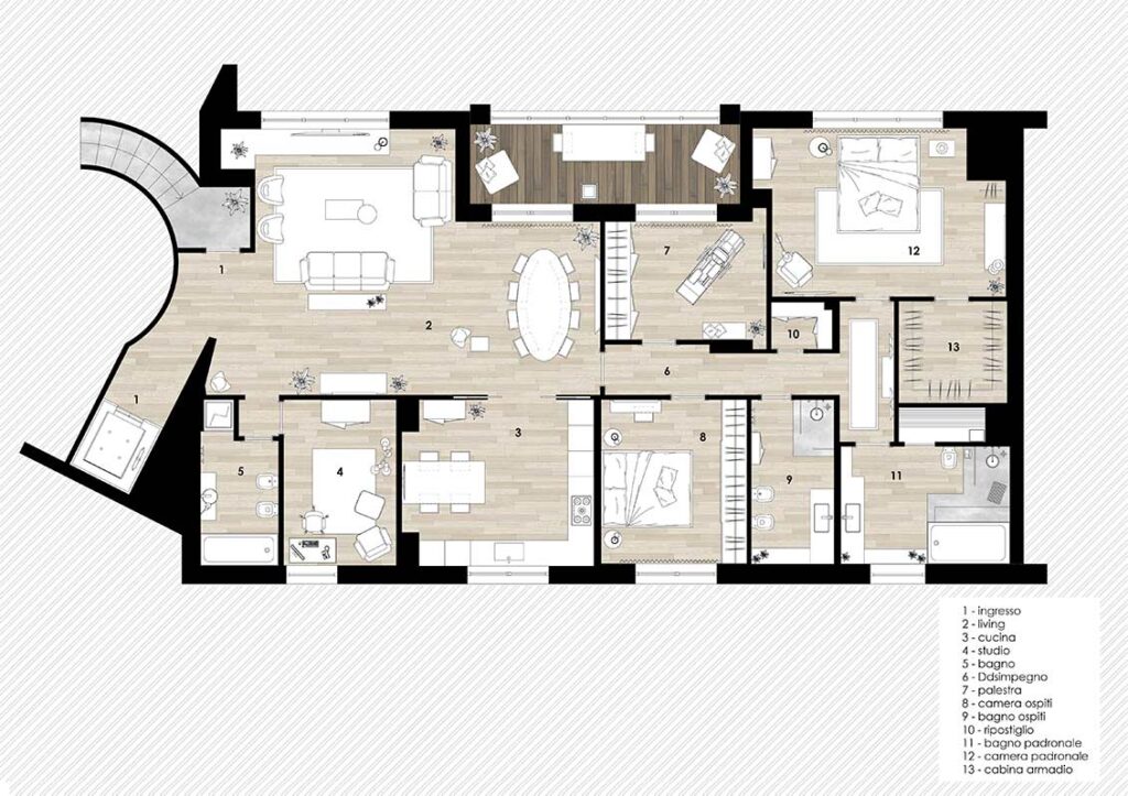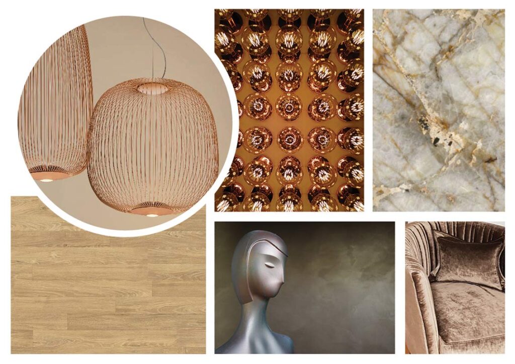 I materiali scelti per questo progetto contribuiscono a definire gli spazi d’uso di questo attico. Toni caldi e freddi sono utilizzati per identificare i vari ambienti. I colori caldi vengono utilizzati per individuare gli ambienti conviviali e padronali tramite l’accostamento di metalli quali rame o ottone, marmi dalle ricche venature dorate, legni, tecniche a parete, rivestimenti e tappezzerie utilizzati nei toni cioccolato e tortora. Le tinte fredde identificano invece gli spazi tecnici o di servizio quali i bagni, la palestra o lo studio, con tecniche a parete effetto cemento, accessori e arredi bianchi o neri e legni appositamente ingrigiti.