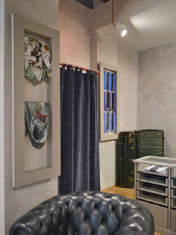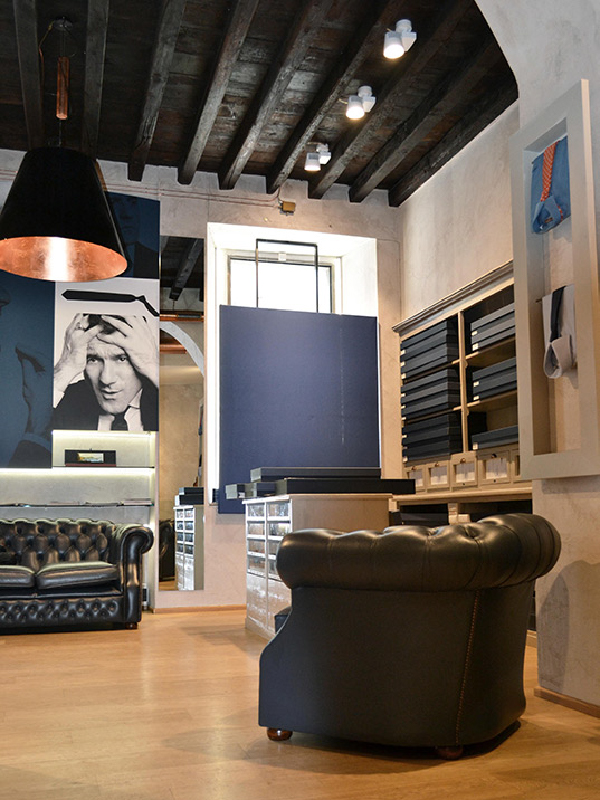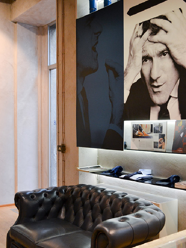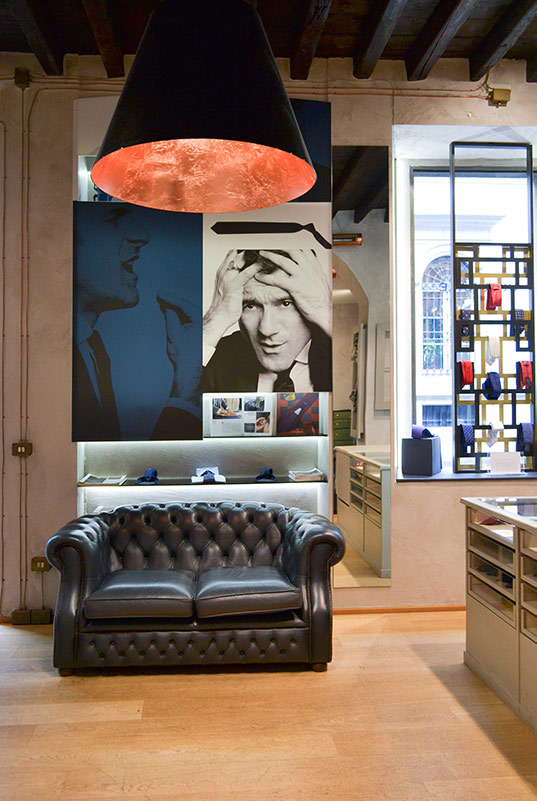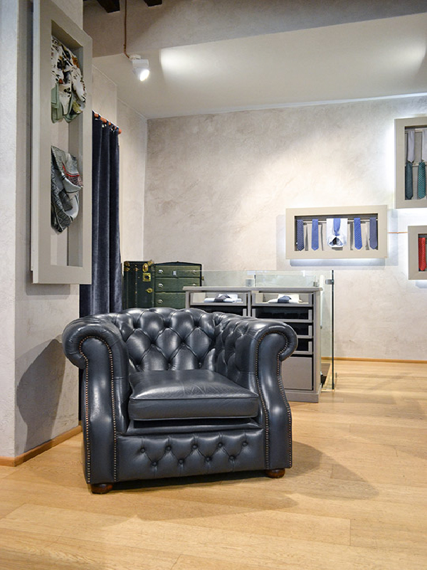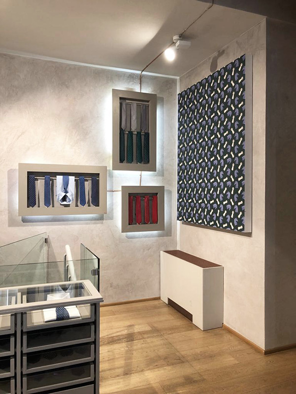 La composizione semplice e caratteristica di espositori verticali sospesi e retroilluminati: grandi cornici, come quadri, in tono con la parete; mobile contenitore espositivo da terra caratterizzato da tagli minimal e moderni; la grande lampada a sospensione in tono con le poltrone scure imbottite in pelle capitonnè conferiscono allo spazio il giusto equilibrio tra classico e moderno.