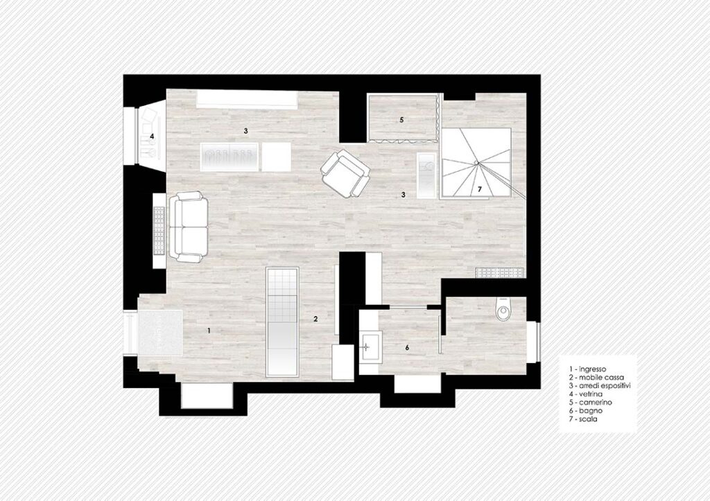 La composizione semplice e caratteristica di espositori verticali sospesi e retroilluminati: grandi cornici, come quadri, in tono con la parete; mobile contenitore espositivo da terra caratterizzato da tagli minimal e moderni; la grande lampada a sospensione in tono con le poltrone scure imbottite in pelle capitonnè conferiscono allo spazio il giusto equilibrio tra classico e moderno.