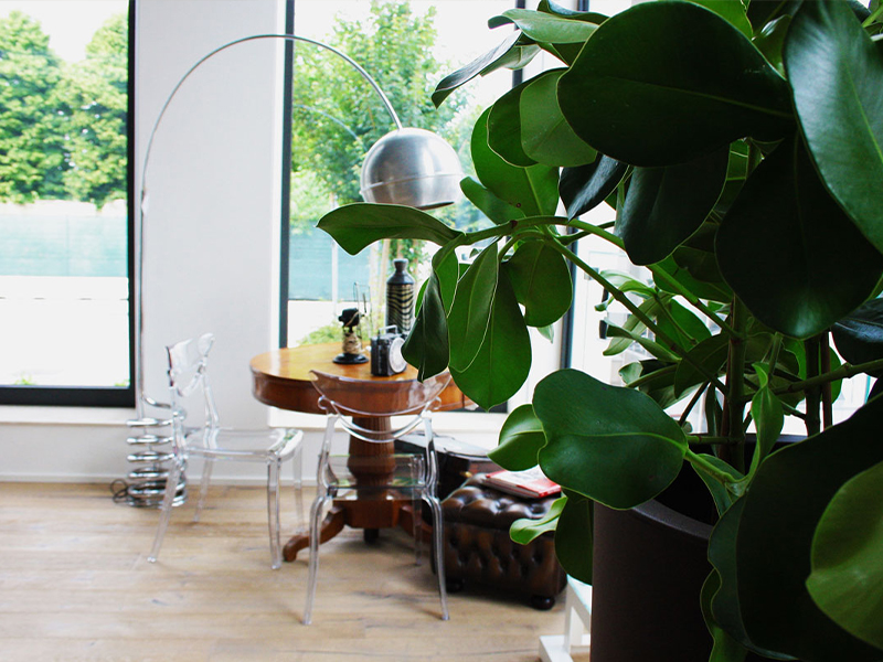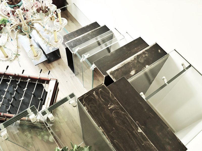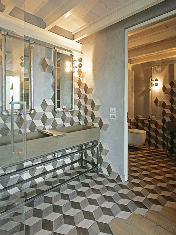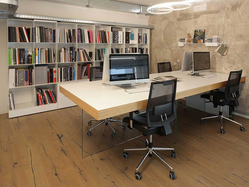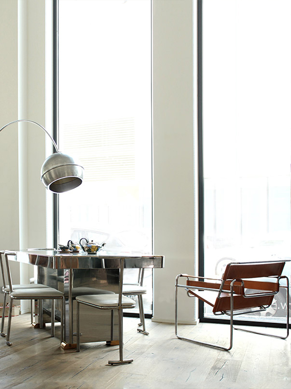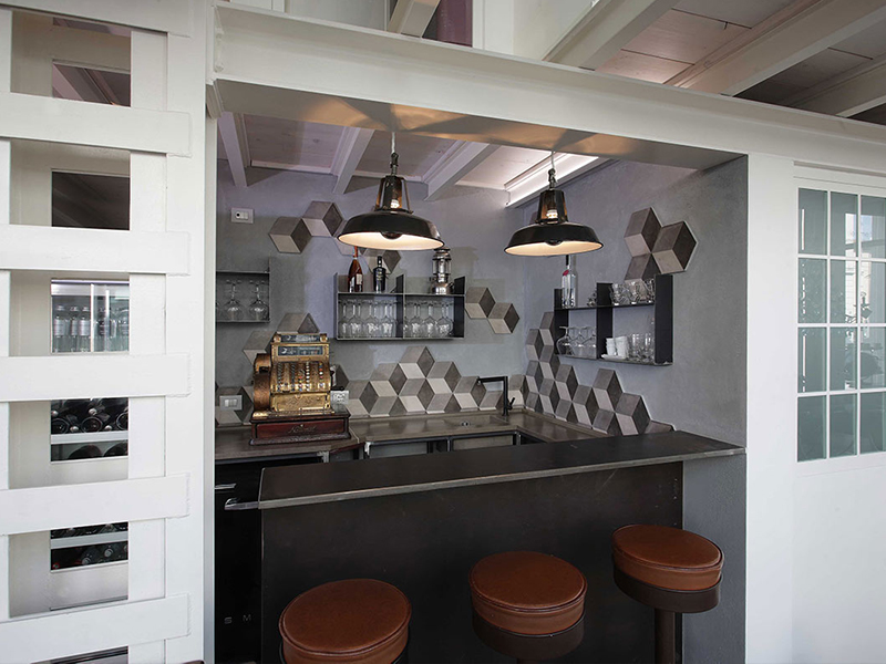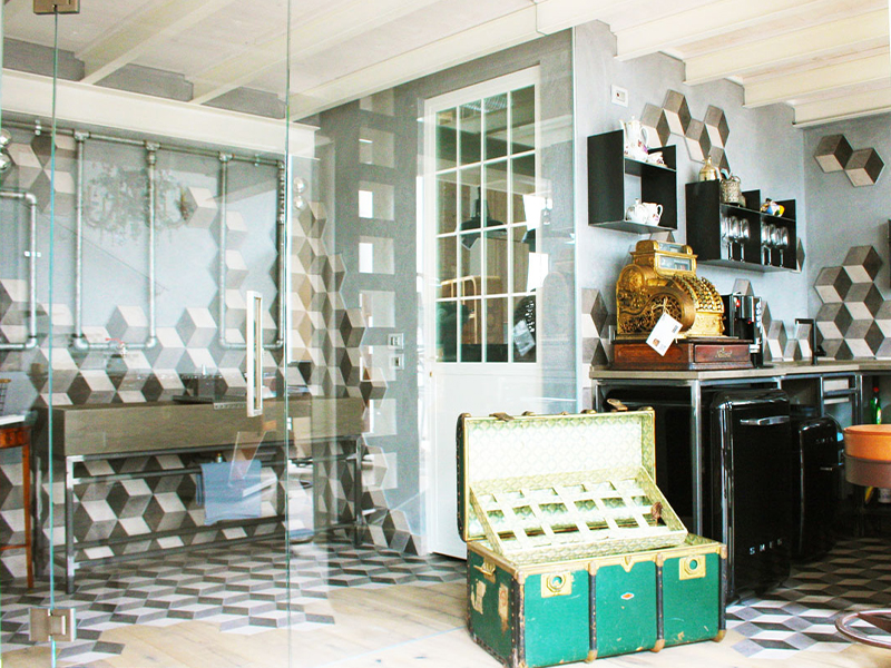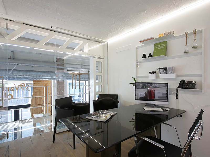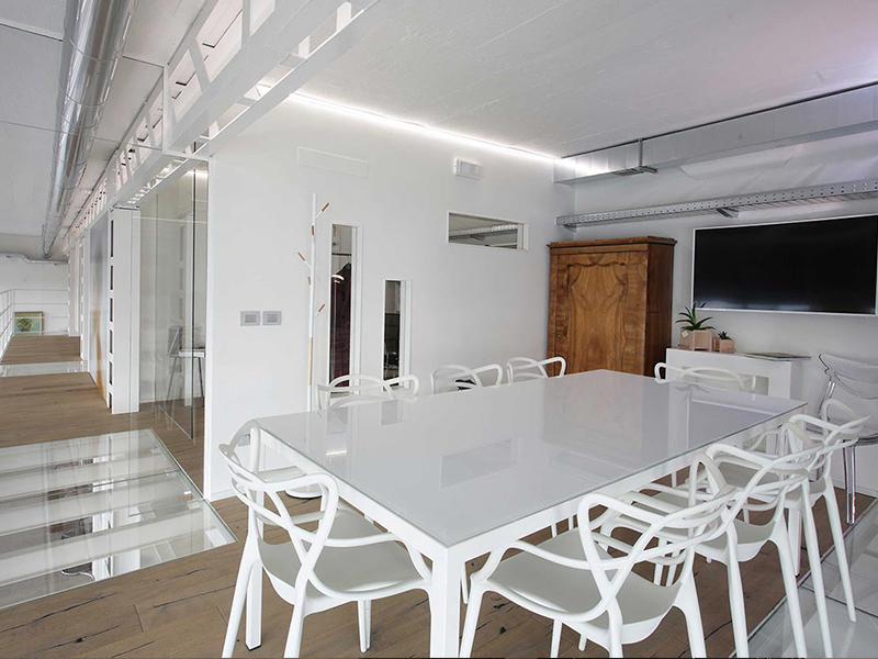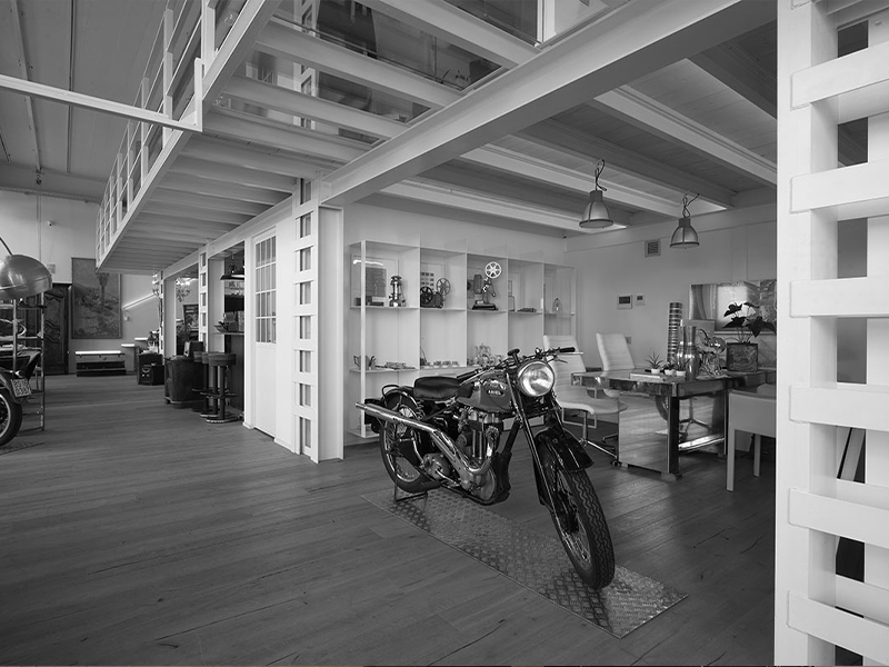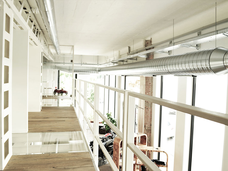 I mattoni del fabbricato preesistente che affiorano qua e là tra le pareti, le grandi vetrate dei serramenti, la scala in ferro crudo e vetro impreziosiscono la natura industriale degli ambienti ristrutturati. Il rivestimento a pavimento in legno si interseca con le piastrelle esagonali dal gusto retrò utilizzate per il rivestimento di bagni e bar. Tubature e impianti a vista, rubinetti a leva, grandi lavabi in pietra naturale poggiati su struttura di ferro. Lo spazio si presenta come un grande open-space sviluppato su due livelli. Piano terra e un ampio e arioso soppalcato.