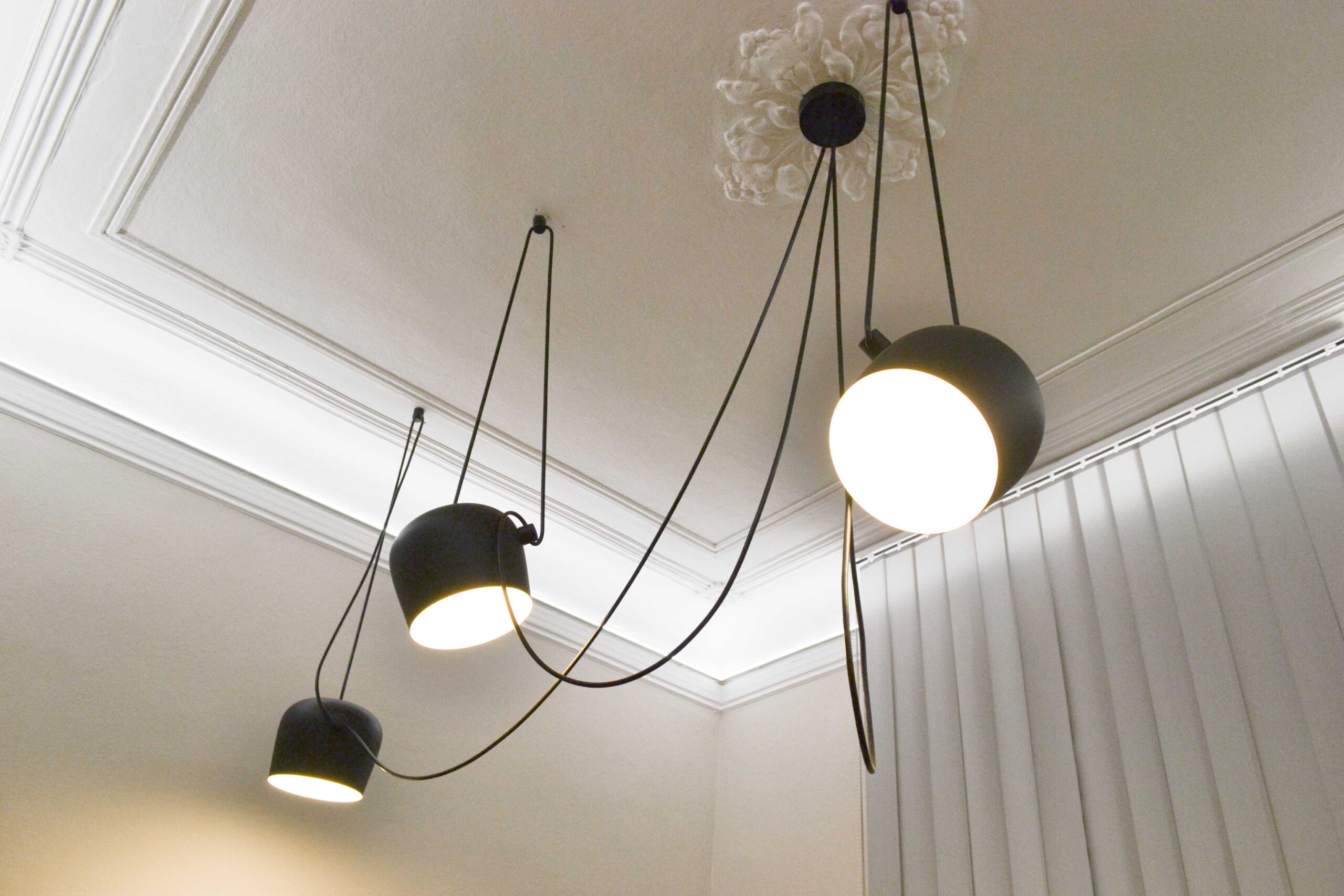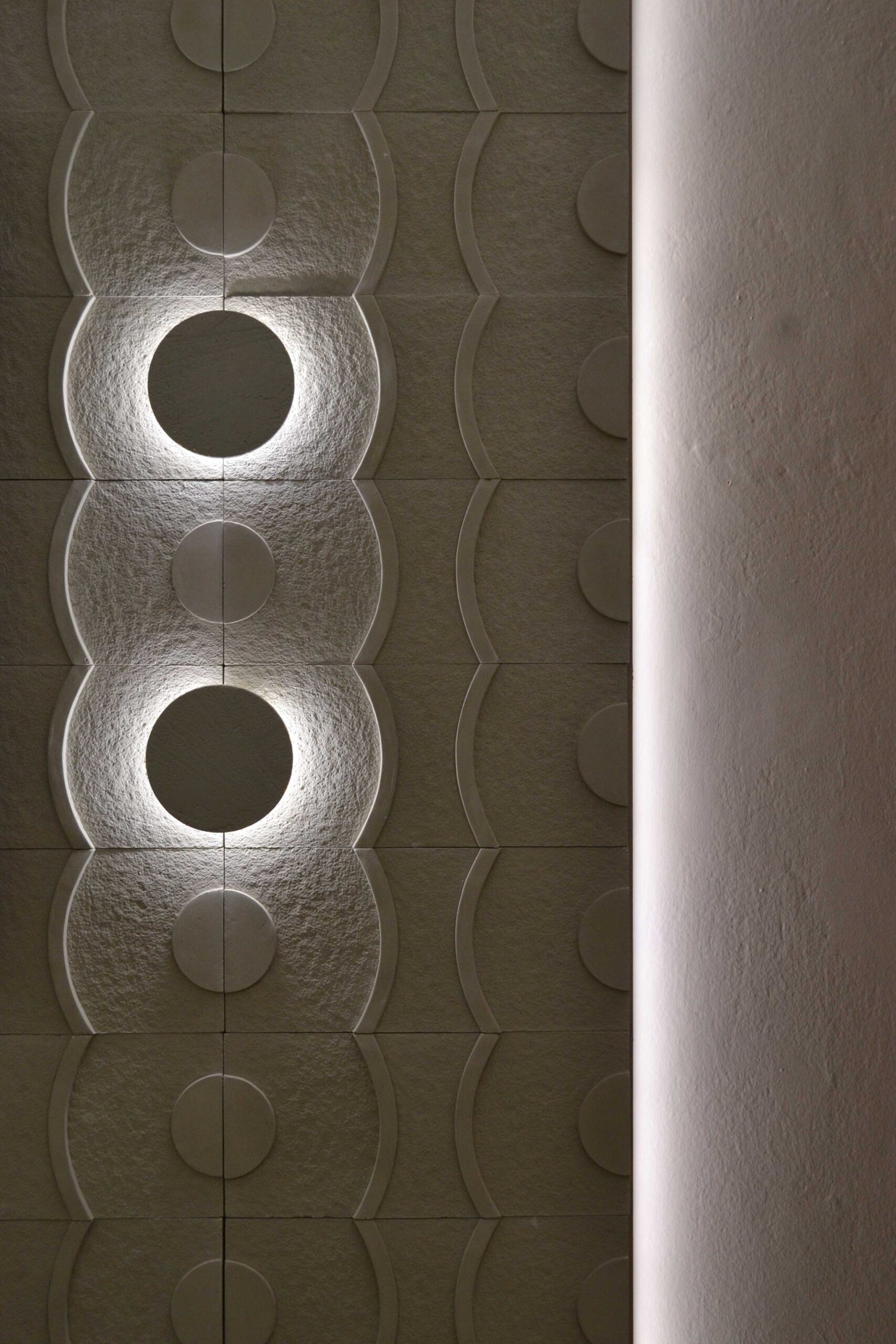 Il sofà in pelle bordeaux, il distributore di caramelle vintage, la boiserie in pietra dalle forme sinuose risaltando dalla contrapposizione del nero lucido degli arredi, dal metallo crudo della lampada da tavolo e dalla accattivante semplicità delle icone del passato e del presente del mondo dell’illuminazione. Un connubio tra l’eleganza dei tempi passati e gli elementi contemporanei.